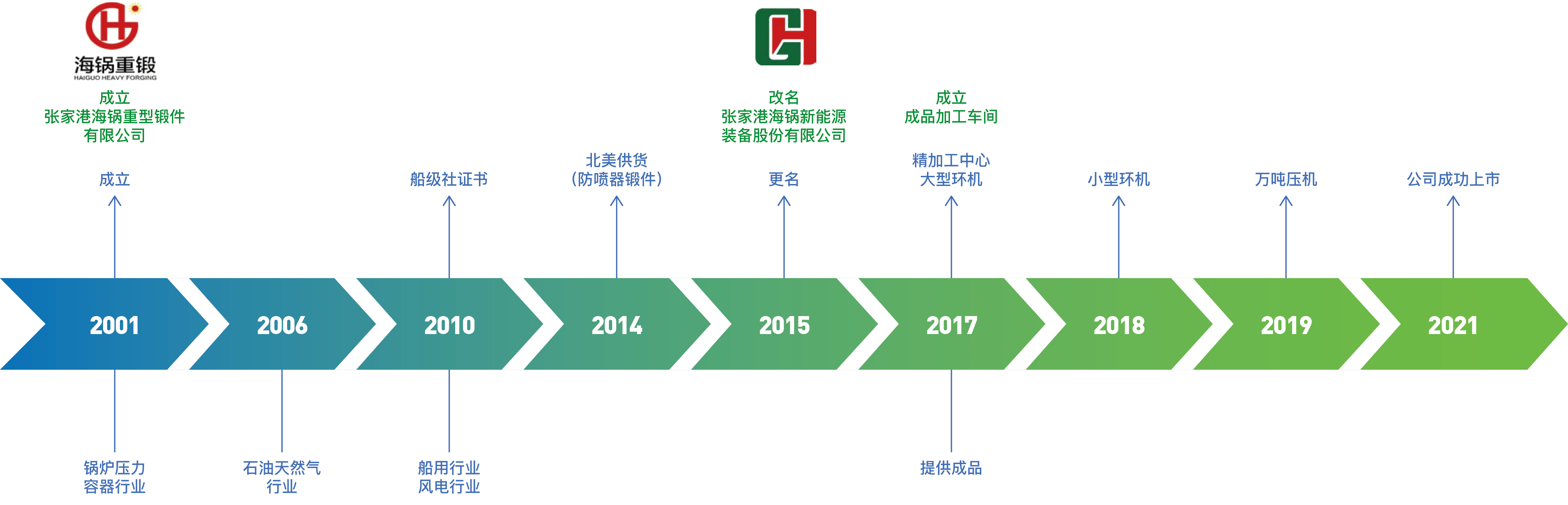 - 张家港海锅新能源装备股份有限公司(股票简称:海锅股份;股票代码:301063)成立于2001年,于2021年9月24日顺利在深交所创业板上市。公司主要从事大中型装备专用锻件的研发、生产和销售,产品广泛应用于油气开采、风力发电、机械装备以及船舶、核电等领域,为全球装备制造商提供综合性能好、质量稳定的定制化锻件产品及零部件。